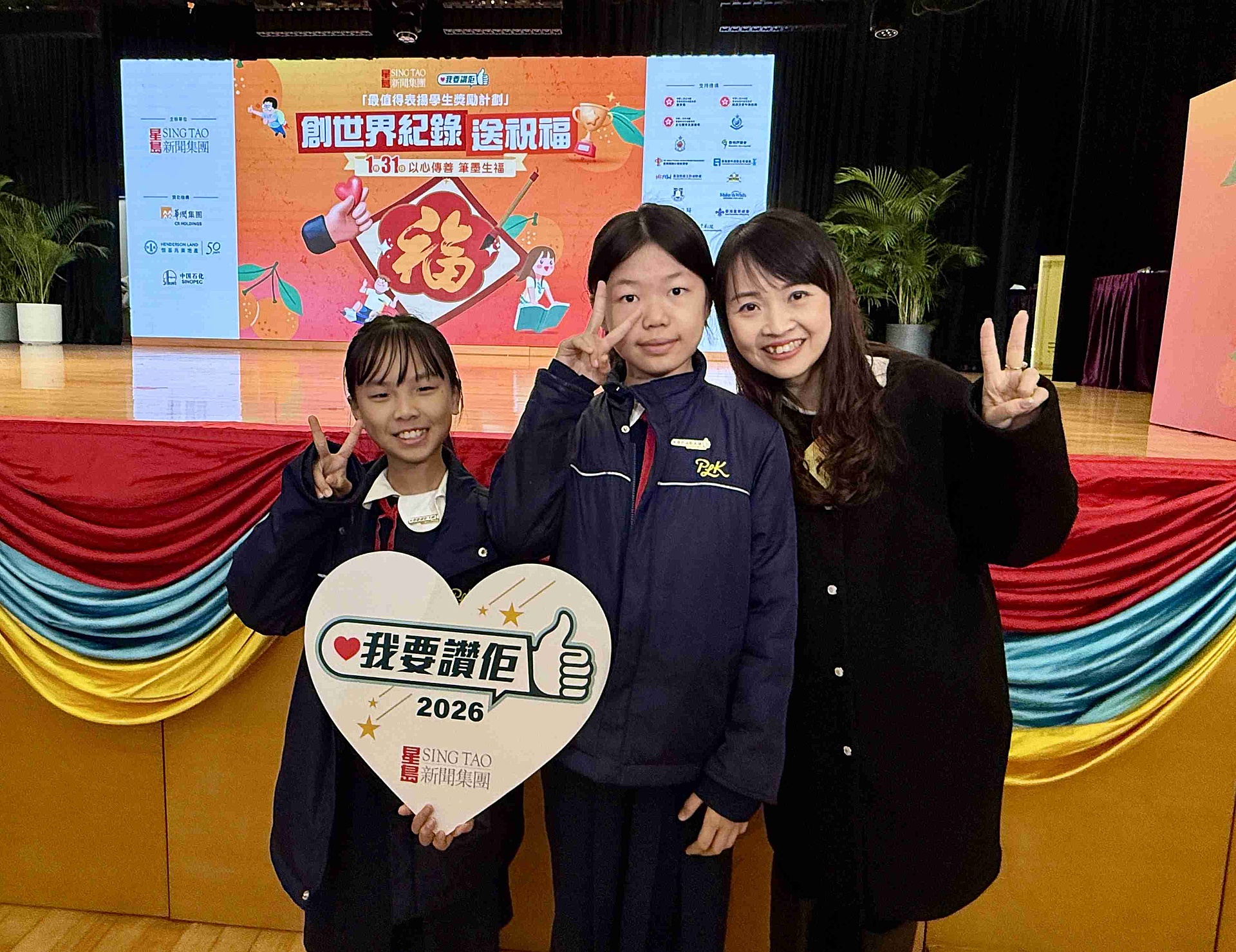 本校五六年級優秀學生獲星島新聞集團《我要讚佢》「最值得表揚學生獎勵計劃」選為學生大使,表彰她們樂於助人、堅毅不屈的品格!她們聯同全港校長老師,齊聚書寫「福」字,挑戰創「最多人同時寫福字」Guinness世界紀錄,向全港市民送上農曆新年祝福!