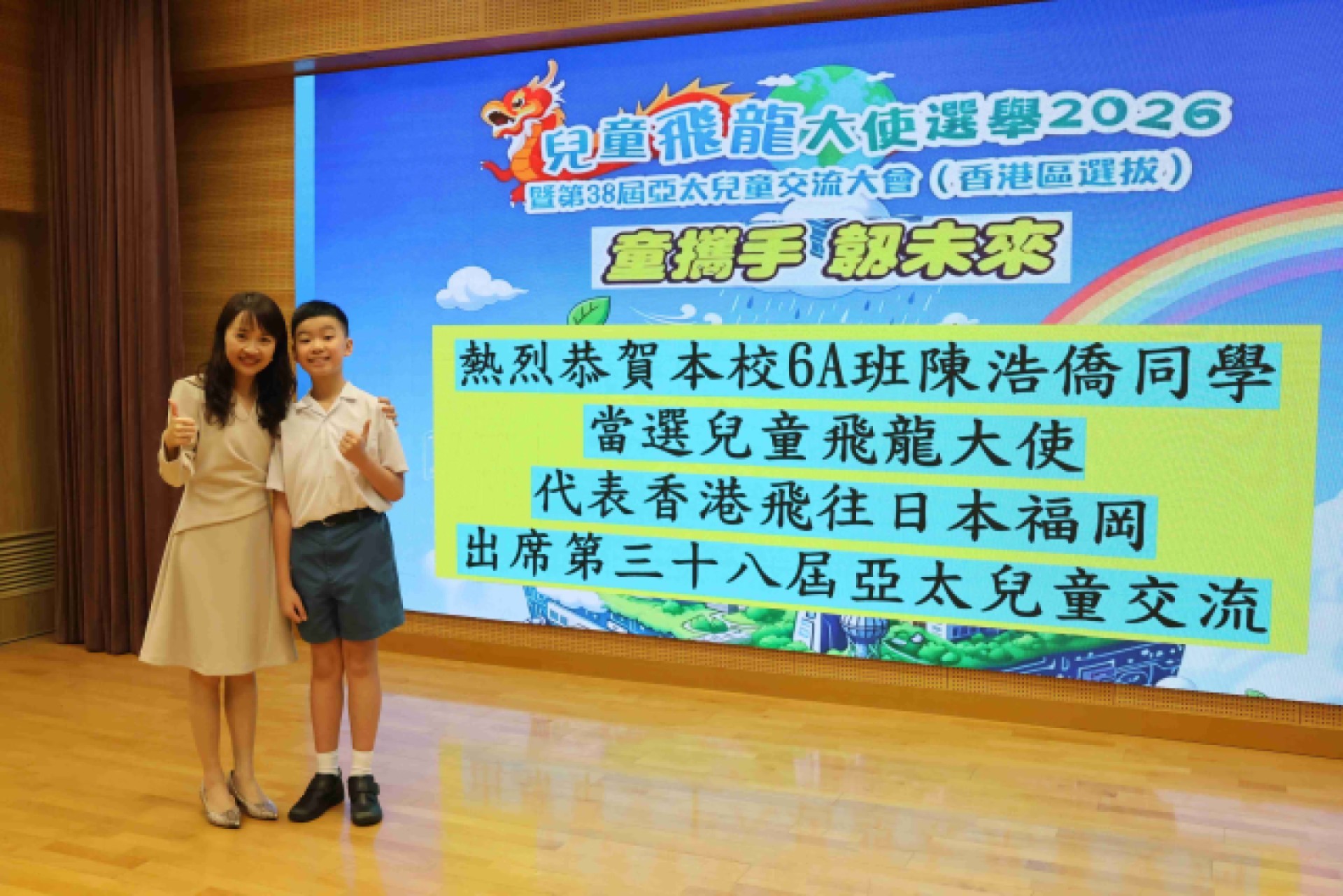 🎉【喜訊】本校6A班陳浩僑同學於「兒童飛龍大使選舉2026暨第38屆亞太兒童交流大會(香港區選拔)」中,從全港超過500間小學的眾多優秀選手中脫穎而出,成功躋身全港僅100個「飛龍大使」名額之列,最終更脫穎而出,成為全港僅六名赴福岡交流的代表之一,實屬難能可貴!這項由城市青年商會舉辦的大型年度活動,以「童攜手,韌未來」為主題,致力培訓環保領袖及國際視野;參賽者須通過初選、訓練營及評審日等重重考驗,浩僑同學最終憑卓越表現勝出,將於7月11日代表學校及香港遠赴日本福岡參加第38屆亞太區交流大會。這份驕人成就,不僅是浩僑同學個人的光榮,更是全校啟程人的驕傲!讓我們一起分享這份喜悅,並祝願他在國際舞台上繼續發光發亮!💪🌏